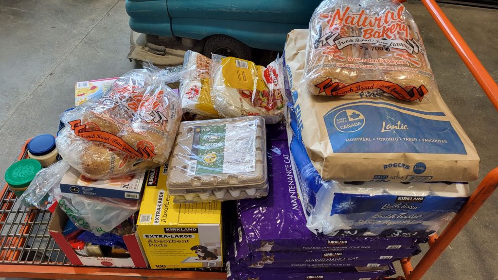 Two 1L of whipping cream, a pack of 60 eggs, hazelnuts, walnuts, stewing beef, 2 packages of wraps, three 2pks of rye bread, 1 brick Old Cheddar, 1 brick mozzarella, a wheel of brie, 5 pounds of butter, 6 pk of canned chicken, peanut butter, truffle parmasan seasoning mix, mayonnaise, a case of mixed fruit packs (with cherry!), kitchen garbage bags, and toilet paper. Oh, and a 20kg bag of sugar!