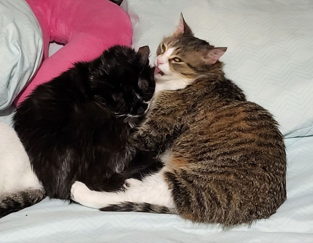 A bonus in doing this is that grandma is no longer hiding out. Instead, she’s been camping out on my bed, where it’s much softer and warmer. Plus, the cats are grooming each other’s ears more – and none are allergic to coconut oil – though not as enthusiastically as when we were using the mineral oil. It was crazy how much Shadow, in particular, kept trying to eat it. I had so much trouble keeping him out of the garbage can, as he’d drag out the paper towel cleaning strips and try to eat them! The coconut oil seems tasty enough that they all groom each other more often, which is improving relationships. They are more likely to sleep in huge cuddle piles, including cats that previously didn’t get along very well.