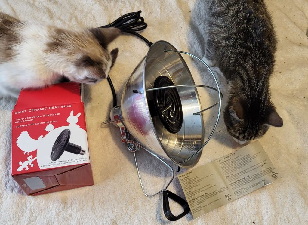 This is much better than what we used before, which was never intended to be used for anything other than keeping the pipes under the kitchen sink from freezing. This is a brooder lamp, so it’s meant to keep critters warm, safely. The bulb guard being particularly appreciated. Sure, a cat could still stick it’s head in, though I’ll be sure to hang it where that is not likely to happen. More likely is an accidental brushing. Between the bulb guard and the depth of the reflective shade, that is no longer a concern.