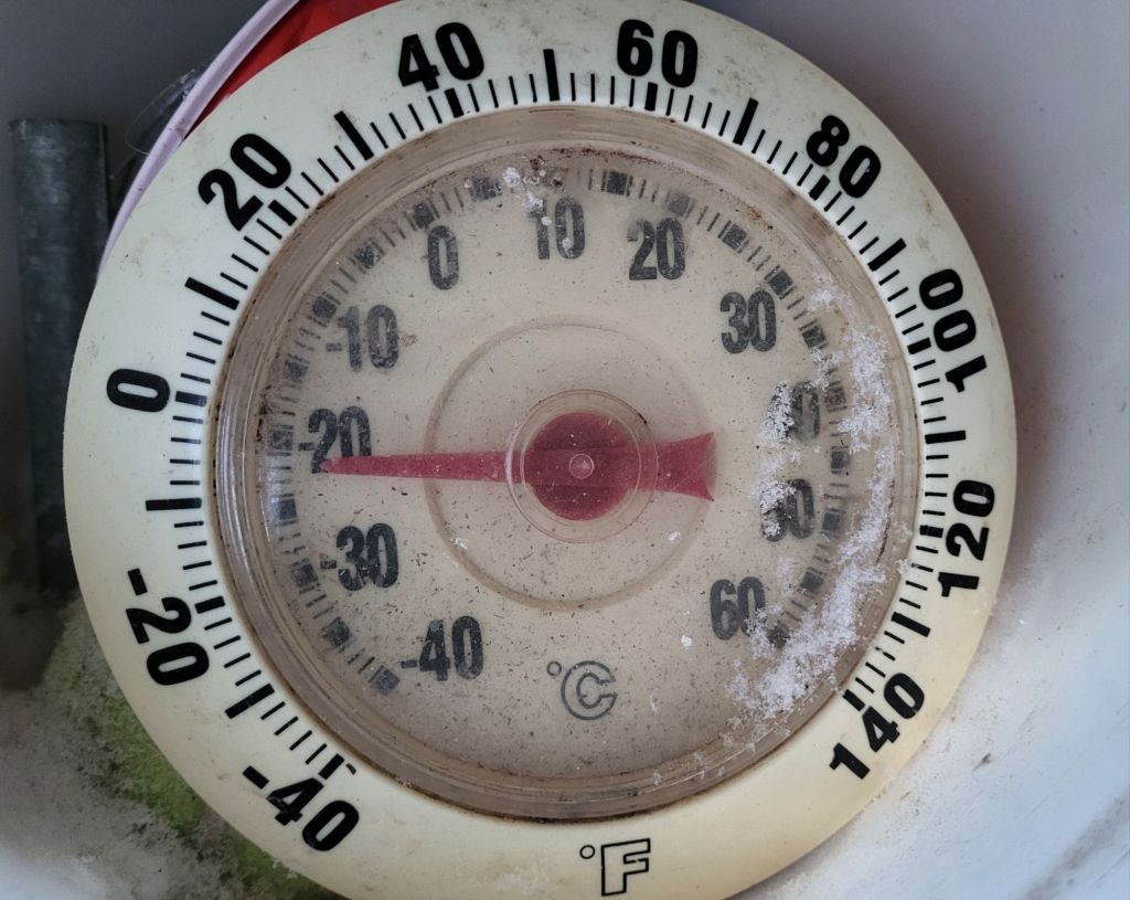 We gave up on keeping a thermometer in the cat house, as they kept knocking it down, but I’ve left it outside, in the top of the shelf shelter, so it’s completely sheltered from wind and sun. I remembered to check it this morning.
