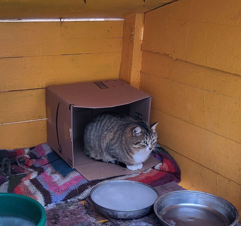 I had intended to put this box in the shelf shelter, as the cats have broken and torn off most of the insulation “walls” I put across of fronts. It’s too big, so I stuck it in the water bowl house. It didn’t take long for Judgement to discover it!