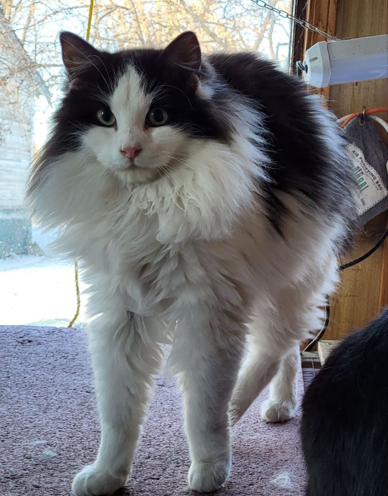 Five years, he’s been showing up at our place and causing trouble. I managed to sneak up behind him while he was eating and pet him once last summer, and it’s like he’s a whole new cat. We’re now able to pet him regularly, though he still has his nervous times. We need to get him comfortable enough to be able to get him into the big carrier. That’s kept in the sun room right now, with the door open, so they can all be used to going in and out of it. I usually find Judgement sitting on top of it when I go into the sun room!