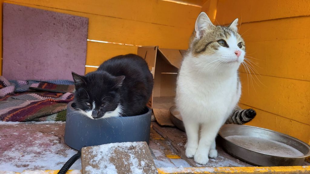 Of course, a dry water bowl is a warm spot, and the outside one was being taken advantage of by a cat I would really like to see more of. This is the one with one messed up eye, and he seemed to be warming his paws while I was putting the kibble out. He wasn’t sitting or lying in it, like I usually see other cats doing. Just standing in it. He didn’t run away while I put kibble in the tray under the water bowl house, either. When I came back with water, I watched him slowly, cautiously walk down the board we have as a ramp and move aside.