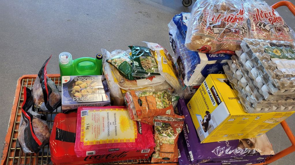 We got the big Kirkland brand package of toilet paper, and I got two double flats of eggs – 10 dozen in total. We’ll be boiling some for Easter, to go with the ones that are pickling in the fridge right now, but mostly these are just for normal eating. I got 5 pounds of butter – they had salted butter in stock this time! – canned chicken, their big Kirkland brand jar of mayonnaise, frozen perogies, basmati rice, and salad mixes. The salad mixes come in two packs, and I got two of those in two varieties, because they’re about half the price as at regular grocery stores! I got a larger container of whole peppercorns, a block of Old cheddar cheese, cream cheese, a couple of 2 packs of rye bread, 4 packages of tortilla wraps and a large jug of laundry detergent. Oh, and two hot rotisserie chickens, one of which is for supper today.