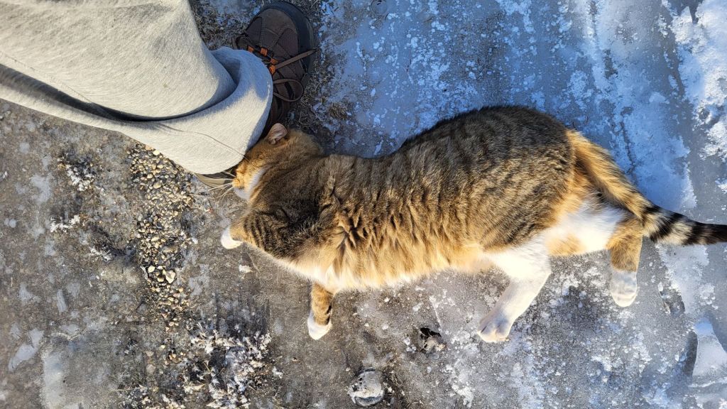 While I was penguin walking over the icy driveway, he kept running ahead, then flinging himself to the ground in front of my feet! Except sometimes, he would fail because the driveway is so slippery, he paws would start skittering, instead. So he’d just run ahead and try again! π I finally got to a patch of exposed gravel, where I could stop and pet him for awhile. At which point, he started running around my feet, then rolling like crazy, making it hard to pet him – or get a decent picture!π
