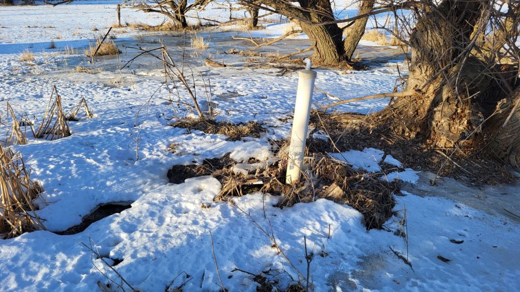 While doing my morning rounds, I went to check the outflow area. It’s not an area we check often in the winter, because it’s so hard to get to. Much to my surprise, for most of the distance to the area, I was actually able to walk on top of the snow and it held my weight! All that freezing and thawing has resulted in a very hard surface.