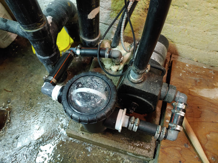 We were having a problem with it yesterday, though. One of the things that was modified on our system was the addition of a pool filter. Greywater from the tank goes through the filter before it reaches the pump, which then sends the water out to the field by the barn. Hang on… I should have some photos. That will make it much easier to explain!