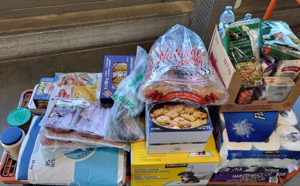 There are also blocks of mozzarella and Old cheddar cheese, plus two 4 packs of cream cheese. My daughter wants to do some baking! There are 5 pounds of butter, a 1L of whipping cream and a 2L of lactose free milk. There are a couple of 2 packs of salad mixes, and finally there are containers of ibuprofen, acetaminophen and house brand lactase.