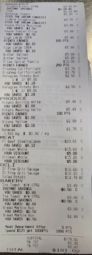 I filled a whole three grocery bags for $181.02m plus a 12 pack of Coke Zero and a couple of bags of potatoes – and that’s with all the discounts and sales I took advantage of!