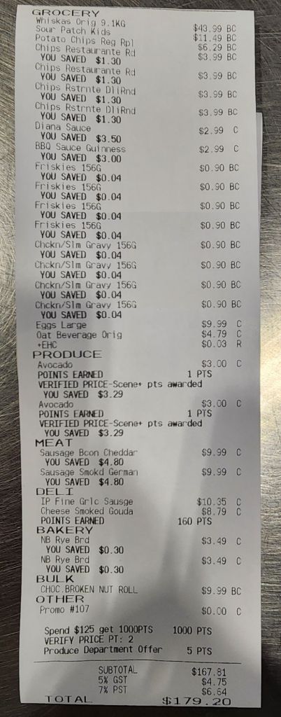 There was a good sale on BBQ sauces, so I got a couple of bottles. Flats of 30 eggs were also on sale, so I got one of those instead of the 18’s I got last time, which were no longer on sale. The girls requested some oat milk.