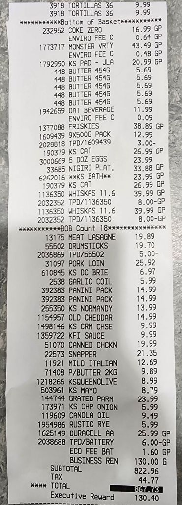 Today’s costs were a bit different, though, in that I renewed my Executive membership, as well as using the annual rebate. The renewal cost $130 and the rebate was $130.40, so they cancelled each other out. That’s why the receipt below has a total of $867.73.