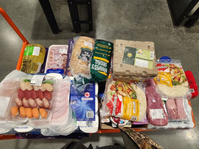 First up, there’s the cat supplies. I got two 11.6kg bags of Whiskas, which was on sale, and two 9.1kg bags of Kirkland brand. One of the Whiskas will be for the outside cats, though we will still be getting 40 pound bags from the feed store. Mostly, it’s to give them variety. The remaining three bags of kibble should be enough to last the month for the inside cats. There is also a case of canned cat food (we’ll need to get more of that before the end of the month) and more puppy pads.