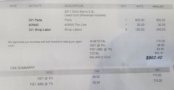 When we got there, I went in to pay. I talked to the owner a bit, particularly since they had just replaced a seal to stop the leak on a Thursday, and the truck broke down on the following Sunday. The problem is, where the damage was done is all internal. The replaced the seals and put in new fluid, but there was no way to actually see. Again, it’s best guess, but those oil leaks I had were leaking all over the differential, so that’s why they figure engine oil got in, and it just wasn’t caught in time. It was totally tried.