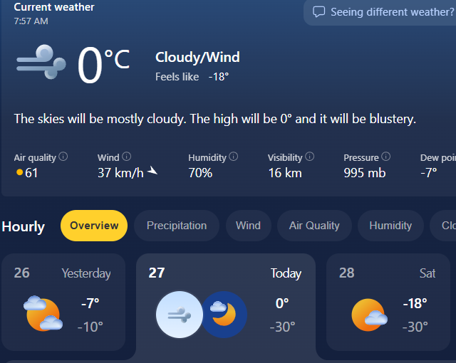 0C/32 with a wind chill of -18C/0F Maybe 2 minutes after I got that screen cap, it had already dropped to -2C/28F with a wind chill of -21C/6F