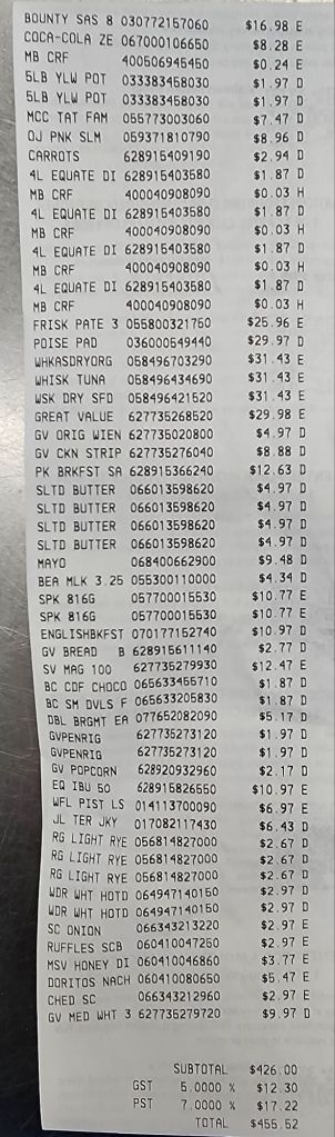 We have our truck back. It’s behaving well. We finally got our Walmart stock up trip done. We would do our usual stock up shopping this coming weekend and I plan to do that as normal, with both the Costco trip and the Walmart/Canadian Tire and maybe the international grocery store run.