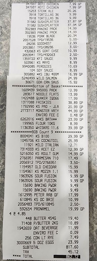 Since we were planning to go to the new Costco this time, my older daughter sent me some funds with a few requests, so this “over budget” total of $862.72 was not actually over budget.