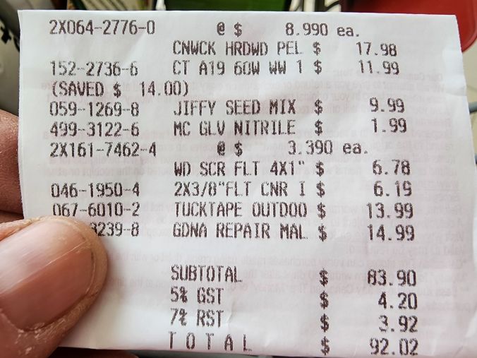 I found some clear repair tape, and a hose repair kit I needed, plus another bag of seed starter mix; I haven’t been able to start the 4-6 weeks before frost seeds, yet, and will soon need to start the 3-4 week seeds.