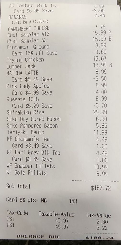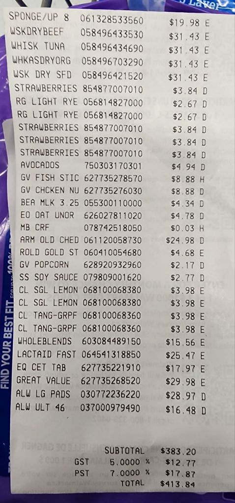 Going through the receipt from the top, there’s a package of paper towels that was marked down in price. Then there are four bags of dry kibble. Two for the inside cats, two for the outside cats. Feed store kibble is cheaper per kg, but this way they get variety, which is better for the cats.