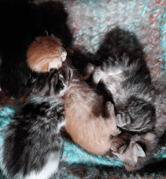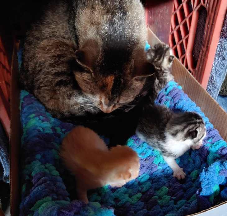 Beep Beep is her mother, but now Two Face is jumping into the nest to mother her mother, and her little siblings. The kittens are even trying to nurse on her! With her belly still half nekkid from being fixed, the nips are easy for them to find. :-D I think they are confused about not getting any milk, though. :-D