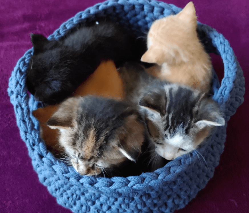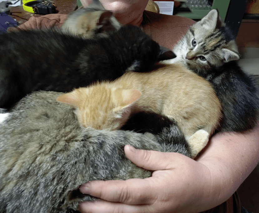 The kittens are almost big enough to start scrambling out of their nest! We’re going to have to find a way to get them back into the basement, and walling off a corner or something, where there is less for them to get into and potentially hurt themselves. Plus, they are going to need room for food/water bowls and a litter pan, so they learn how to use them, soon!