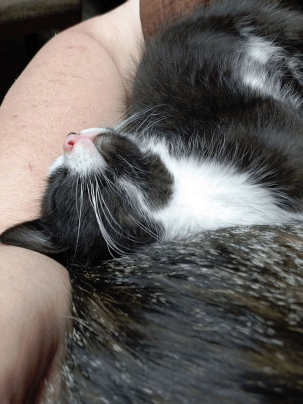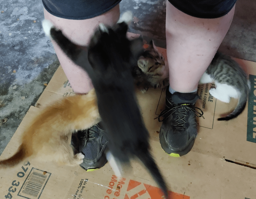Also, by the time I left, my calves were bleeding, from having pairs of kittens wrestling on each one.