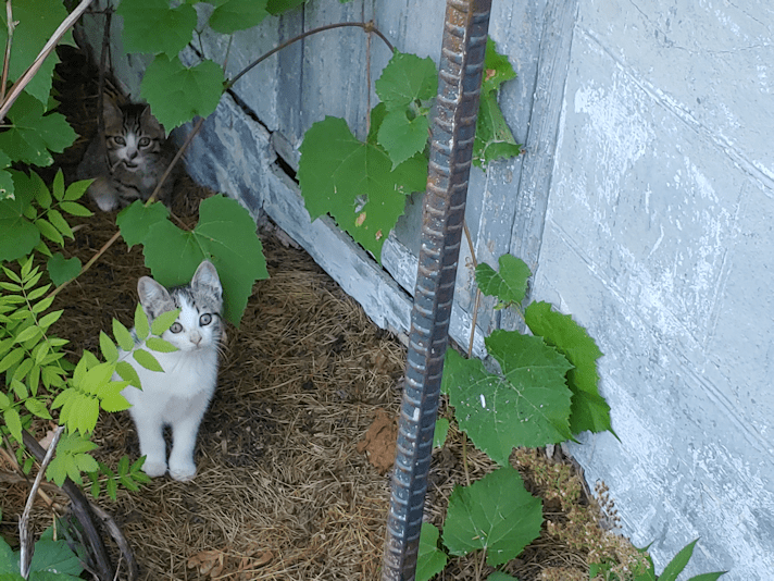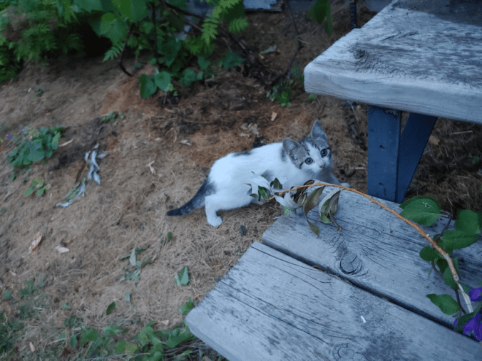 It had been a while since I’d seen the outside kittens, so I was happy when they showed up this evening. Little Braveheart had follow Junk Pile to the food bowls by the house, but ran off when I came out. They hung out by the steps into the storage house, before hiding in the grape vines, so I decided to sit on the steps and see if I could tempt them to play.