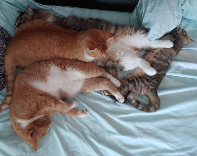 It took quite a while to extricate all the cats, but we managed to do it without shredding my clothes too badly, nor adding any new scratches.
