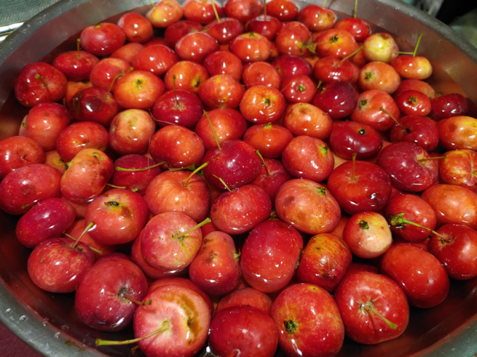 Since I was doing a lot more crab apples this year, I put the cut pieces into water with a bit of lemon juice as I worked. Last time, for the amount of apples I can, there was no need for anything to keep them from browning until I was done. I cut them all into halves or quarters, depending on the size of the apple – or used what was left after cutting off any nasty bits! As expected, there were some losses, but not all that much. In fact, I could have done with fewer apples for the jars!