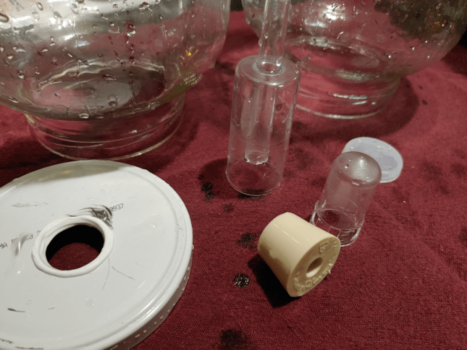 Last year, I sterilized things with boiling hot water. Since then, we have started brewing, so along with extra airlocks, we also have sanitizing solution. So one of the changes this year is to use that to sanitize everything, instead of scalding them.