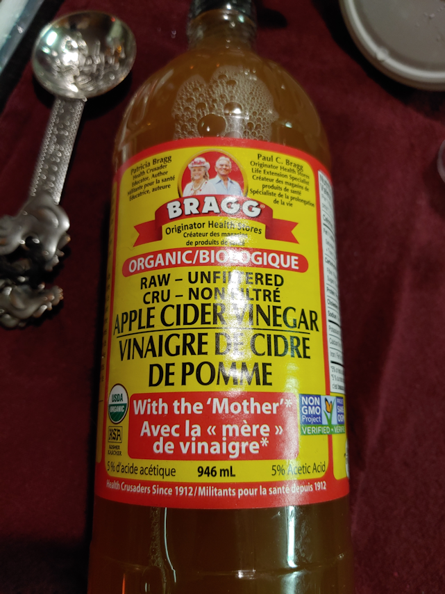 I’ll admit that when I normally buy apple cider vinegar, I buy whatever is cheapest. It gets used as an ingredient in cooking, so I don’t feel the need to anything fancy or expensive. When making the cider vinegar last year, it relied on the water, sugar, apples and whatever natural bacteria in the air “contaminated” it. Since I plan to use an airlock this year, and everything has been well sanitized, it’s not going to get that exposure. So I picked up a bottle of Bragg raw, organic, unpasteurized ACV, with the “mother”, to use as a starter and introduce the little critters needed for fermentation.