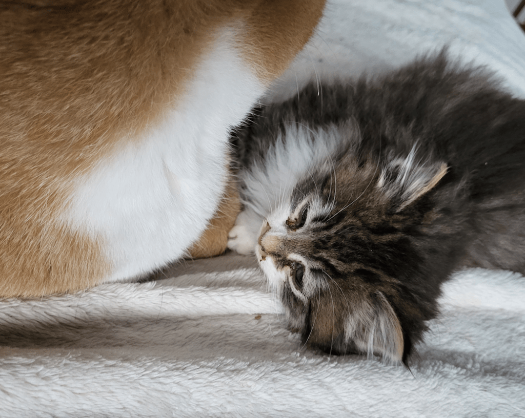 Cheddar was willing to cuddle, but when Bitty started trying to get under him to nurse, it was a bit too much!