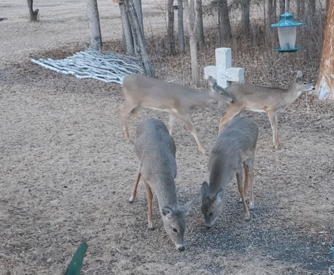 Two pairs of deer came by – but they were NOT together! They kept fighting each other and chasing each other away from the feed. I do try to spread it out, but by the end of the day, there isn’t much left.