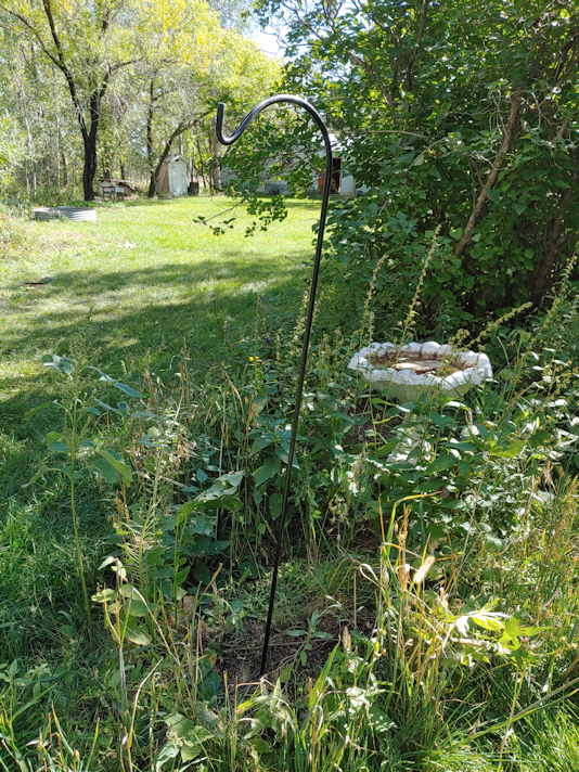 I decided to set it like a fence post, in the same spot as before. The new metal support we have the suet cage hanging from was set aside, and self-seeded flowers and bird seed plants cleared away. Much of it was already empty, though. I don’t know what cats were fighting in there, but they flattened everything around the bases of the bird bath and feeder!