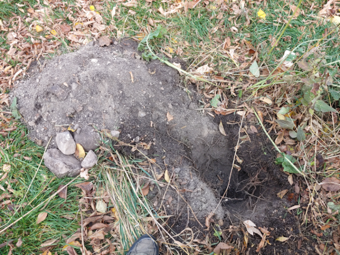 I half considered trying out one of the old post hole diggers we found, but as I dug, I immediately started hitting rocks, so I’m glad I didn’t! The soil is a lot deeper here than in other areas; I just started to hit sandy soil when I stopped. Very different from the soil further away from the house.