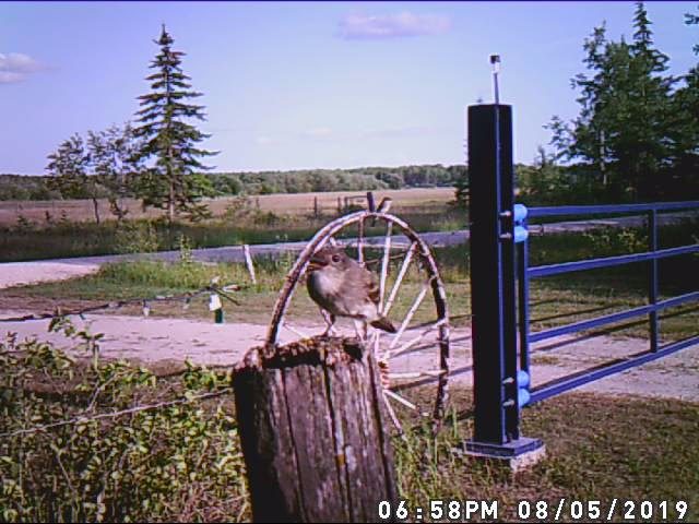 An excellent video of a bird that landed on the post! There’s a second one on the wagon wheel in the background.