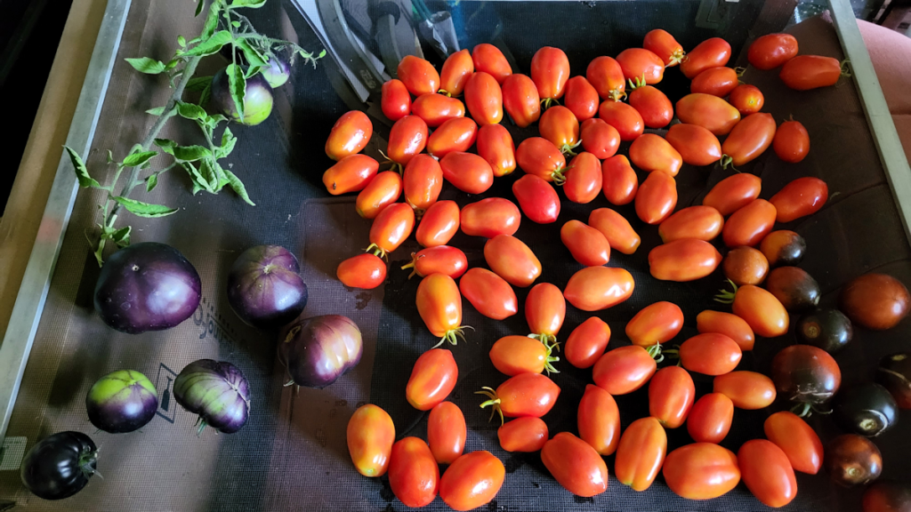 The chocolate cherry had the most to pick green. There were a few Black Beauties and Sub Arctic Plenty to pick. These are now sitting near the window in the cat free zone (aka, the living room) to ripen.