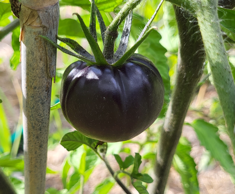 The Black Beauty tomatoes have a lot more tomatoes forming than seems obvious, at first glance. Some of the stems are so dark, it’s hard to see the dark tomatoes against them. This one, however, is so dark, and was shining in the sun! What gorgeous tomatoes!