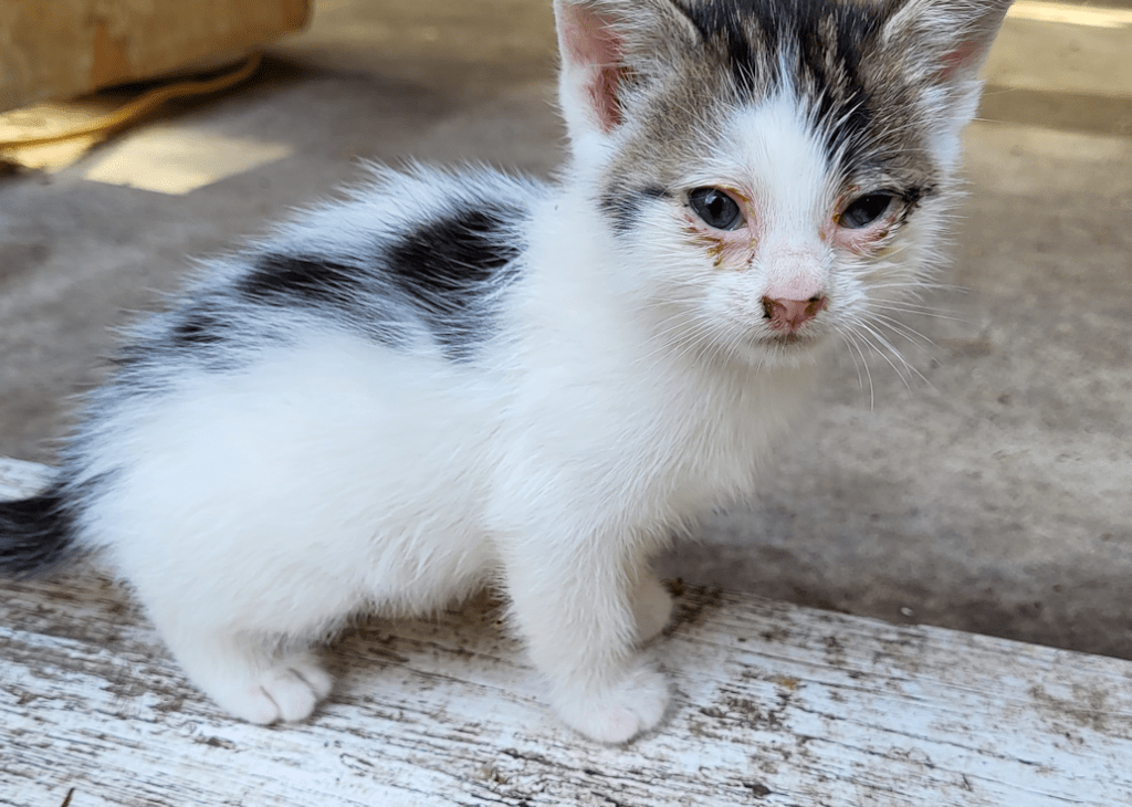 Its eyes weren’t stuck, but there was a lot of crud around one of them, and its nose was partially blocked, so my daughter cleaned it up as much as the kitten could tolerate while I held it. This kitten is starting to get used to being handled, and doesn’t run away like the other kittens. It even comes right up to me, sometimes, and lets me pet it.