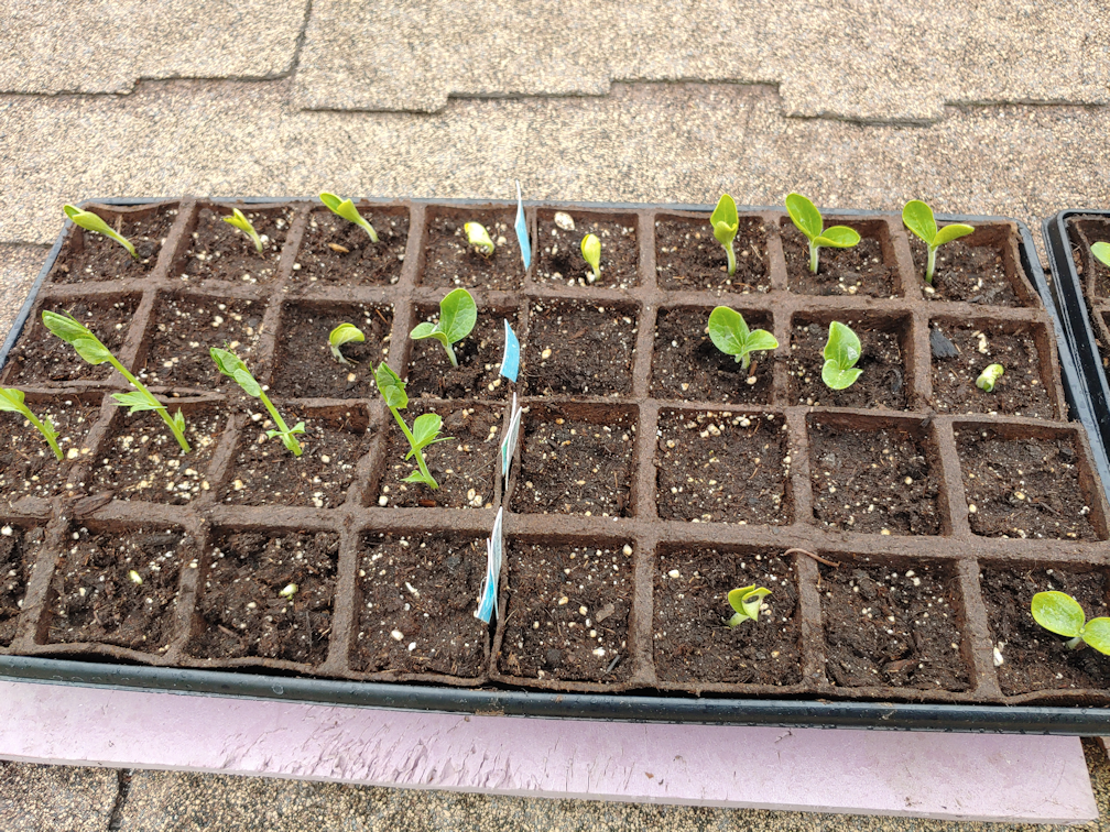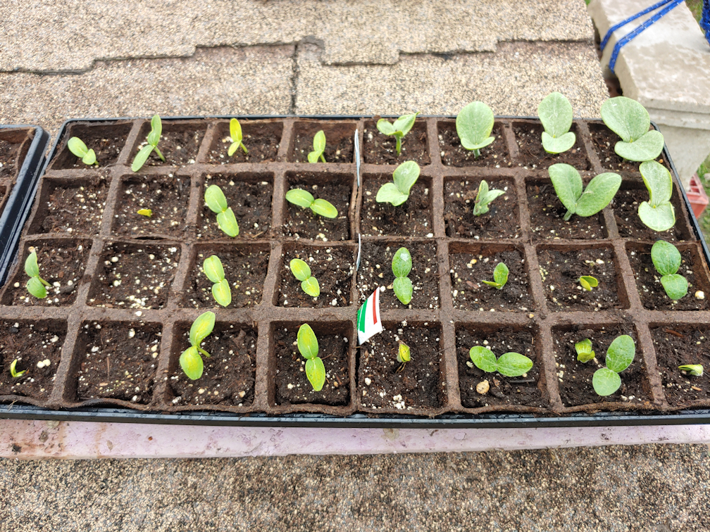 The purple peas in this tray are getting nice and big. The summer squash in the other cells took a long time to germinate, too, but they seemed to get a boost after I put the warming mat under them. It’s hard to see, but even the green zucchini is finally germinating, next to the peas. I thought the Magda squash had started to germinate, but not quite yet. We had less success with those the last 2 years we planted them, too. Our first year, we had only 2 surviving plants. Last year, there was just the one. Magda squash just seems to have a harder time of it.