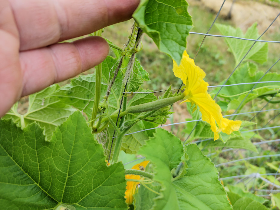 I don’t know that we’ll have enough growing season left for these. I tried starting them early enough indoors compensate for that, but these are among the ones that were sown a second time. The first ones that survived are at the chain link fence and, while they have been blooming for a while, there are still no female flower. Even the Crespo squash, which have also been blooming for a while, are almost all male flower. There were two female flower buds that started to form, but the first one wizened and fell off rather quickly, and now the second one looks like it’s doing the same.