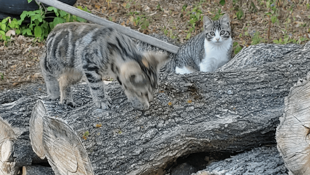 While doing my rounds last night, I found Junk Pile Kitten at the stack of maple wood behind the house, playing with other kittens.