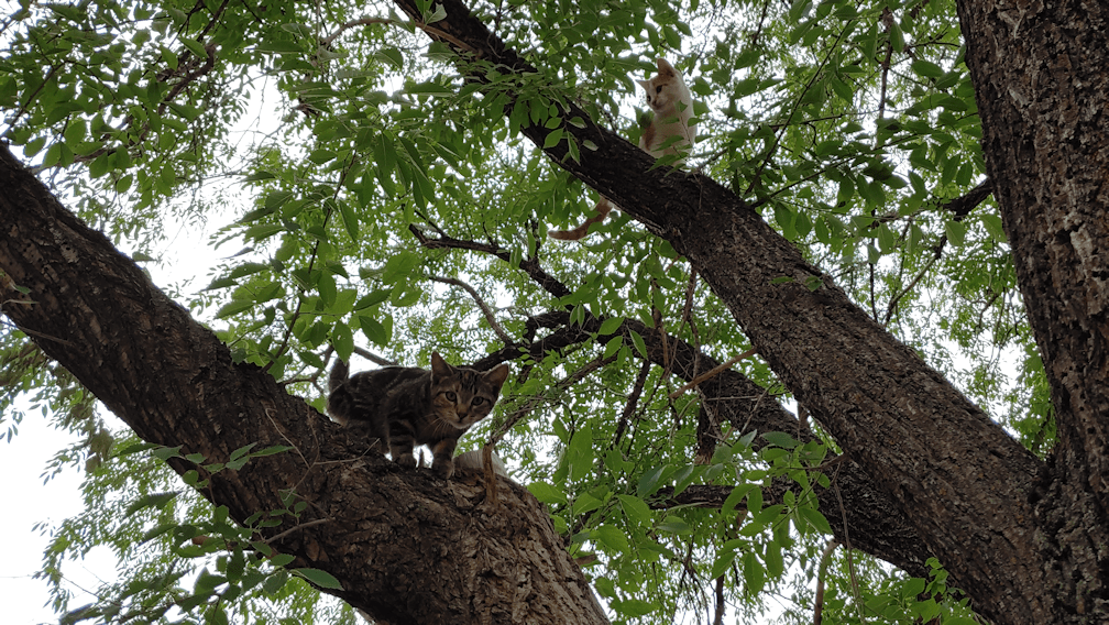 Unfortunately, that made it more vulnerable to kittens, with no way for us to protect it. It couldn’t even be seen anymore. The kittens, however, saw it go into the branches and were making a run for it!
