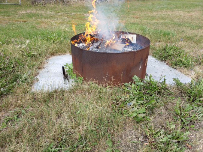 While doing my rounds, there was no wind at all, and the ground was covered in frost. I decided it was a good time to do a burn in the fire ring (the burn barrel is too old and damaged to use anymore). The fire ring is where we put the used stove pellet litter. It has time to dry before we do a burn, along with any paper garbage we have that can’t be composted so we don’t have to drag it to the dump, plus a few branches or whatever wood that’s around to keep the fire going stronger.