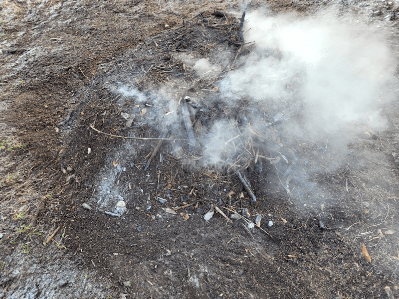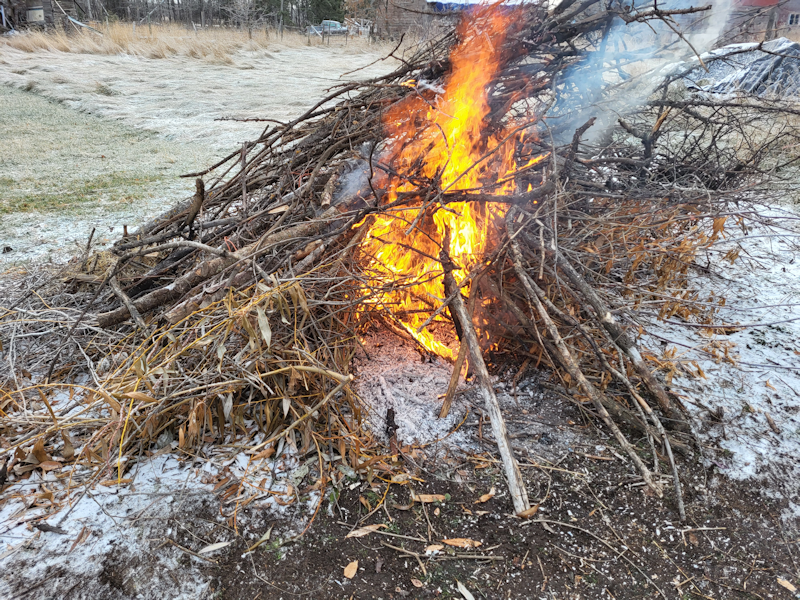 The branch pile I burned yesterday smoldered all night. I left my computer on with the live feed for the garage cam aimed at it, so it could be monitored. When the camera switched to infrared, I could see hot spots glowing through the falling snow. This morning, I broke it up a bit to stir the embers around, then raked it into a smaller pile. This will keep smoldering for days, if I keep banking it like this, which is what I want. We still have the other, bigger pile to burn, but there is no hurry on that.
