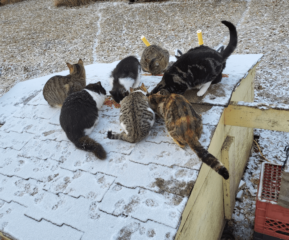 When I was done with the shovelling, I spotted Shop Towel visiting the kibble house (making 31). You can really tell he’s the daddy of all those white and grey kittens!