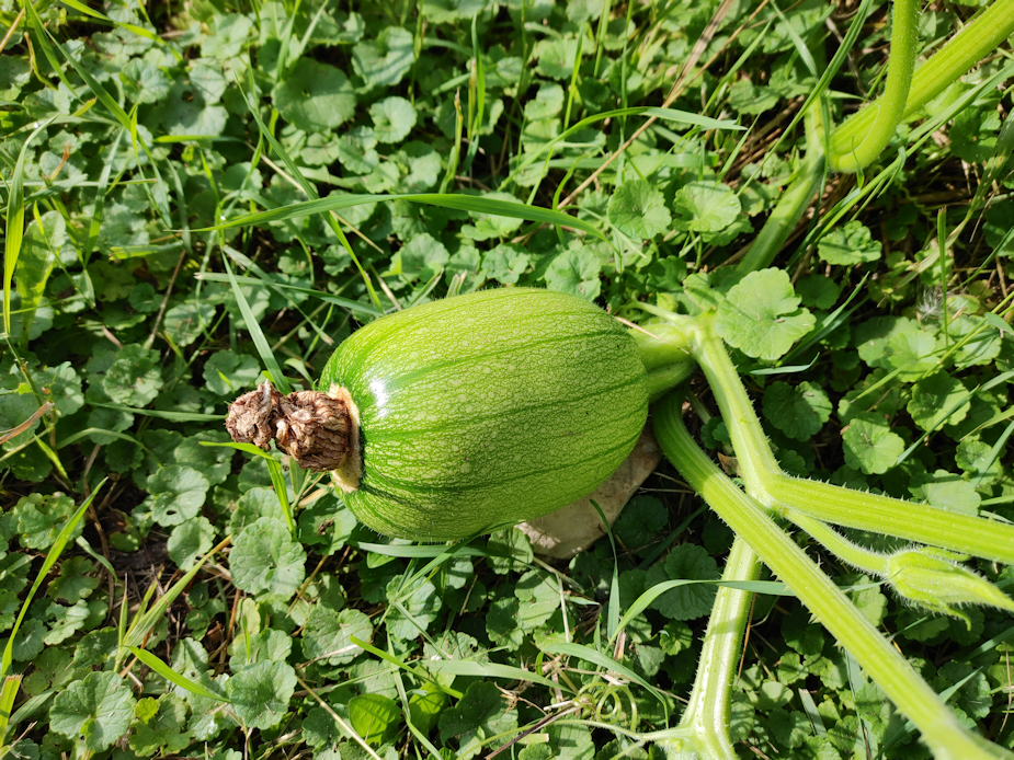 Of the two other pumpkins spotted, this one is making it and growing fast. The other did not get pollinated, and withered away. I see no other female flowers, so we’re probably just have the two.