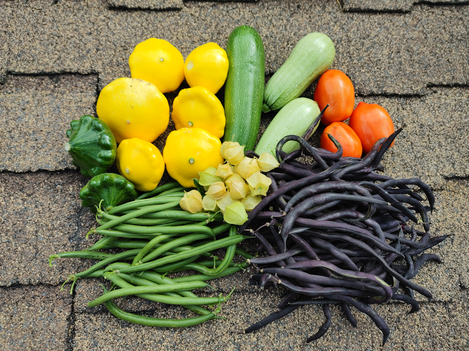 We have our first beans of the year! The purple Carminat and the green Seychelle pole beans. The one San Marzano tomato I’ve been keeping an eye on was looking ripe, and when I touched it, it fell off the vine on its own. I was even able to grab a small handful of Dalvay shelling peas.