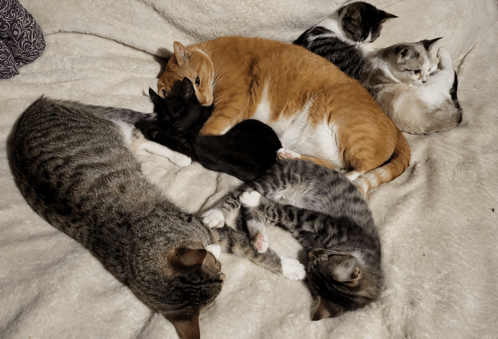 The outside cats do their fair share of cuddling, too – mostly because they’re all in the bigger cat bed, under the heat bulb!