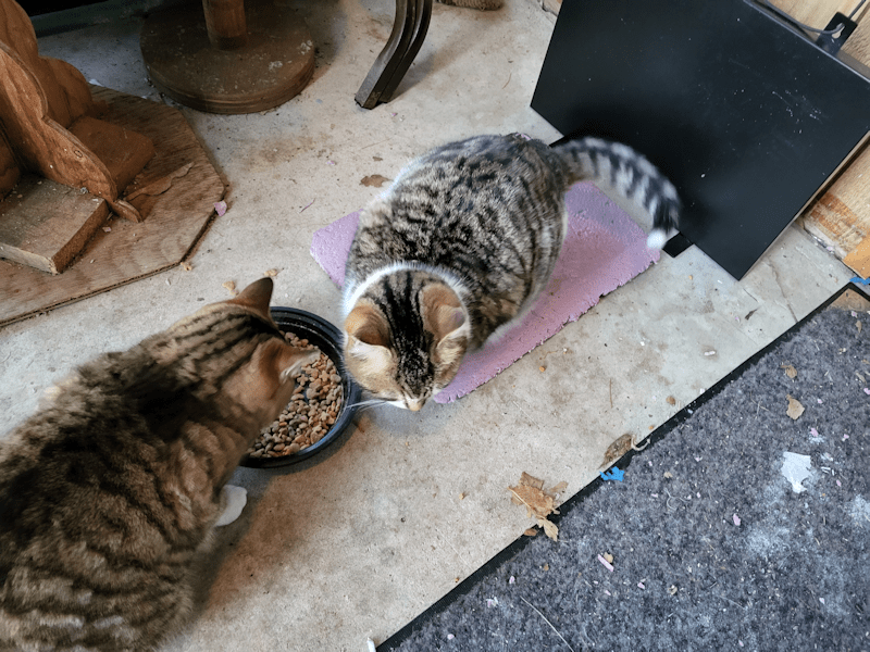 There is food and fresh water by the house, but the kittens just won’t come over. I’ve seen the white and grey sneaking over to the shrine food bowls, and I think I’ve even seen him go into the isolation shelter or catio. The smoky kitten, however, will not go more than a few feet away from the garage. I only have a food bowl for them in garage, not a water bowl. I want them to come to the house! Pinky does, but she hates other cats and any kittens not her own. She will attack any that come too close. If they come near the garage, she will drive them away. Even the littles.