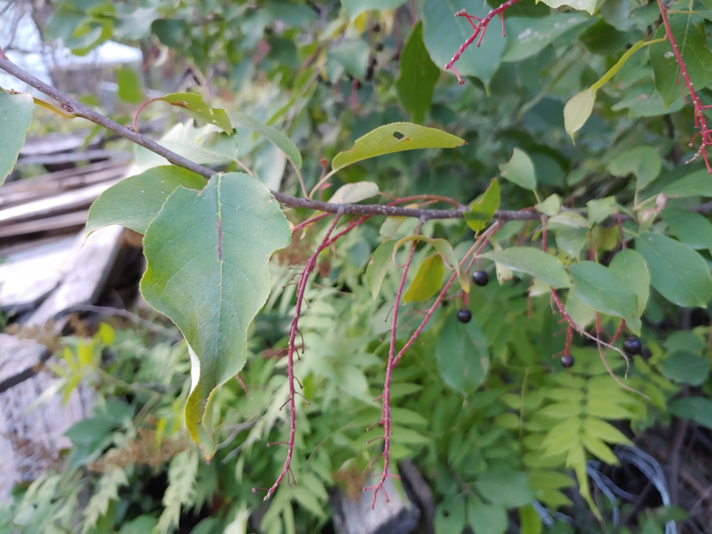 There are SO many grape clusters! I’m still amazed. The most we’ve ever since since moving here. It will be some time before they’re ripe, though. The chokecherry tree by the compost ring and low raised beds will be ready to harvest soon. Actually, there are two of them, very close together. There’s a larger, healthier looking chokecherry tree by the main garden area, but with the tall trees beside it, it doesn’t get anywhere near as much sun as the one by the low raised beds. The berries on there are still mostly green, and there are far fewer of them. These trees are still pretty spindly, as they were quite choked out until we cleaned up around them, but they are just covered with berry clusters, weighing down the branches.